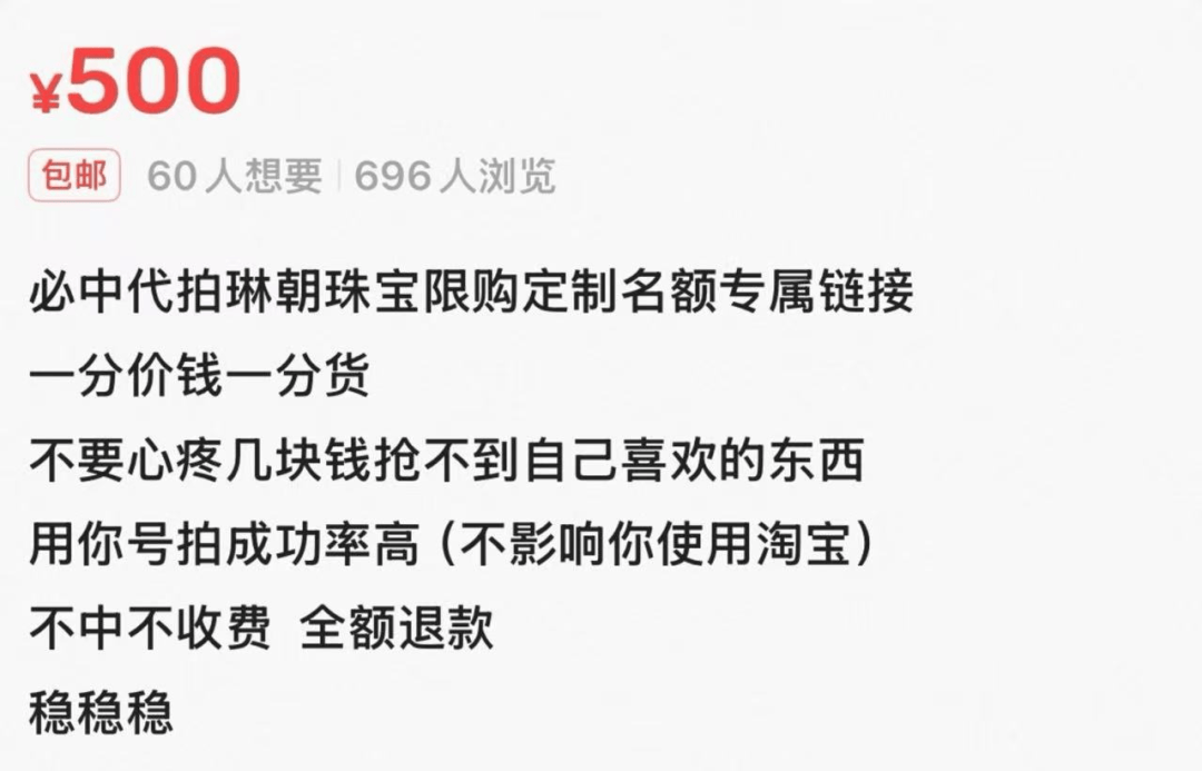 其中琳朝的走红依赖一种“稀缺性”——极难买到现货,定制时间超过1年,因为仅有兰州市一家门店,就连去门店购买的名额都需要在小程序抢。抢不到的线元找黄牛拍代买名额。