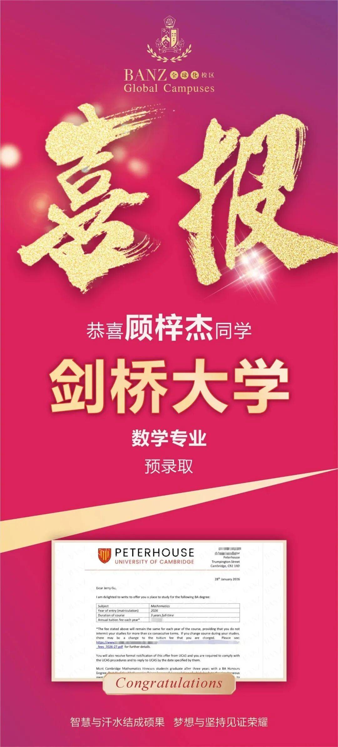 截至今日,BANZ 2026届学子累计斩获2枚牛剑Offer(1枚牛津大学、1枚剑桥大学)!至此,BANZ已连续5年斩获牛剑录取,累计收获12枚牛剑Offer!