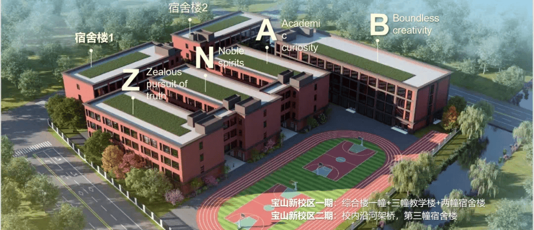 BANZ 行中旗舰校坐落于上海顾村公园旁,占地 200 亩,校园融入 π 空间概念,一期建有综合楼、三幢教学楼和两幢宿舍楼,二期规划校内沿河架桥及第三幢宿舍楼。作为上海唯一开设澳洲 VCE 课程的国际化学校,这里汇聚了顶尖师资 —— 原复旦附中副校长、科创特级教师杨士军注入科创特色,原上外浦外英语特级教师沈华引领双语教学。